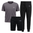 Colors: Grey (T-Shirt), Black (Shorts & Trousers)